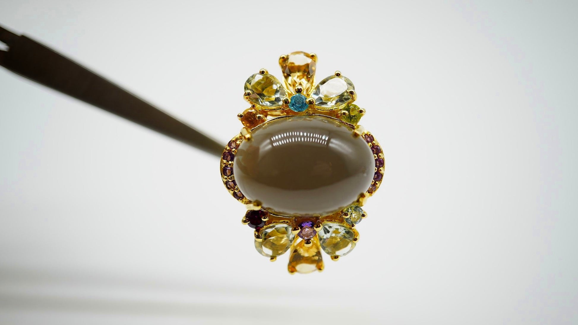 This captivating statement ring features a massive 70-carat gray moonstone, radiating a soft, ethereal glow, beautifully complemented by vibrant green and blue topaz, golden citrine, and hints of purple-red accents. The 106 total carats of natural gemstones make this an extraordinary, one-of-a-kind piece for gemstone lovers.