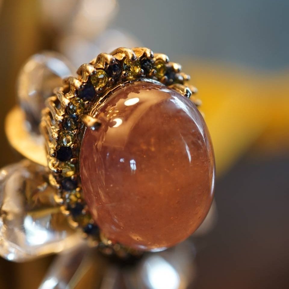 This stunning statement ring features a 49-carat yellow sapphire with a rare nude-toned translucency, shifting between golden beige and soft orange hues depending on the light. The blue sapphires and peridot accent stones beautifully enhance the center stone, making this piece even more striking in person. Crafted in sterling silver plated with 18K white gold, this ring is both unique and elegant.